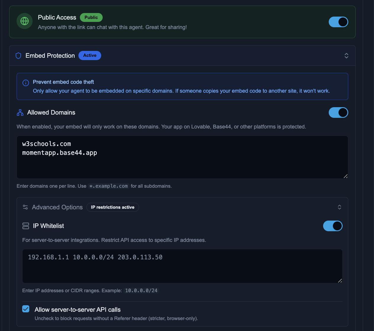- Public Agent Protection - Use Embed Protection and IP Whitelisting to control who can access your public agents